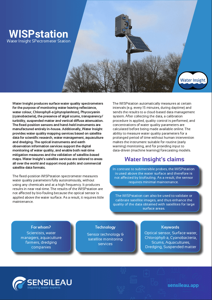 High frequency measurements for more insight in the ecological status, bathing water information and a coupling with new techniques such as monitoring with satellites.... Where do you want to go with your water quality monitoring? The WISPstation optical measurement station does all of these.
